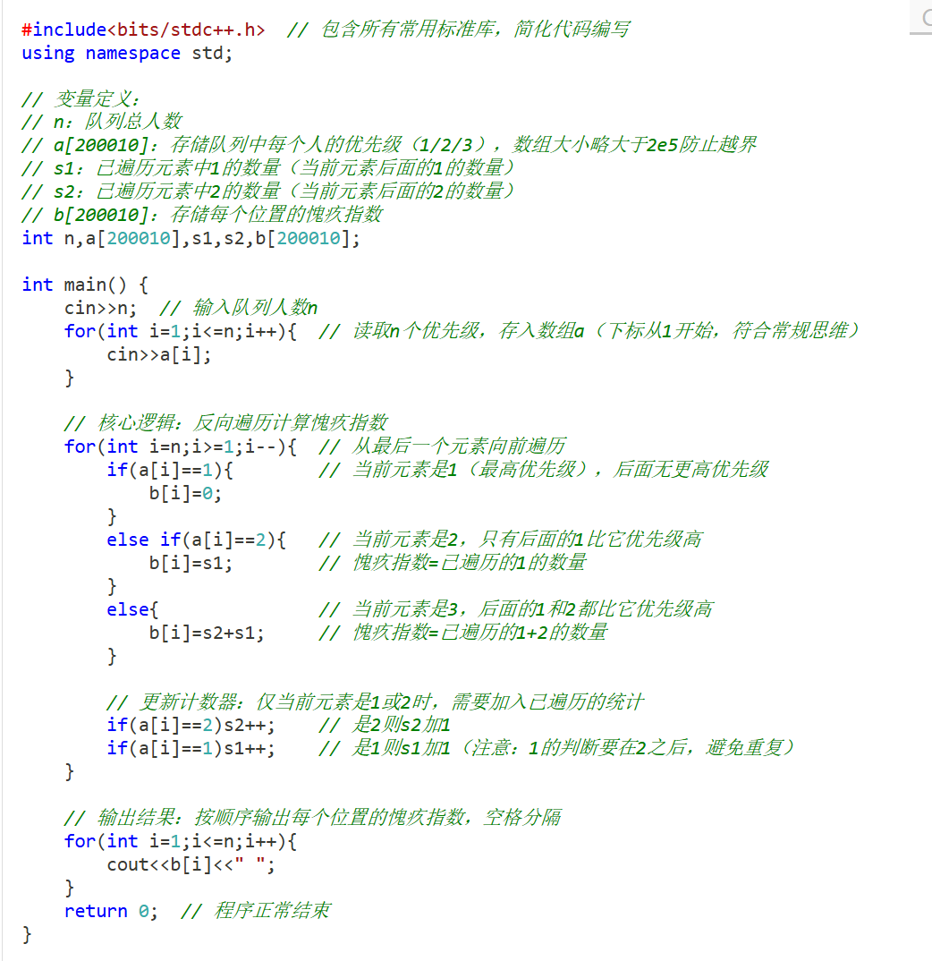 - 时间复杂度优化:题目中n的上限是200000(2e5),若采用“每个位置遍历后面所有元素”的暴力解法(O(n²)),会因超时无法通过100%数据,必须设计O(n)的线性时间解法。